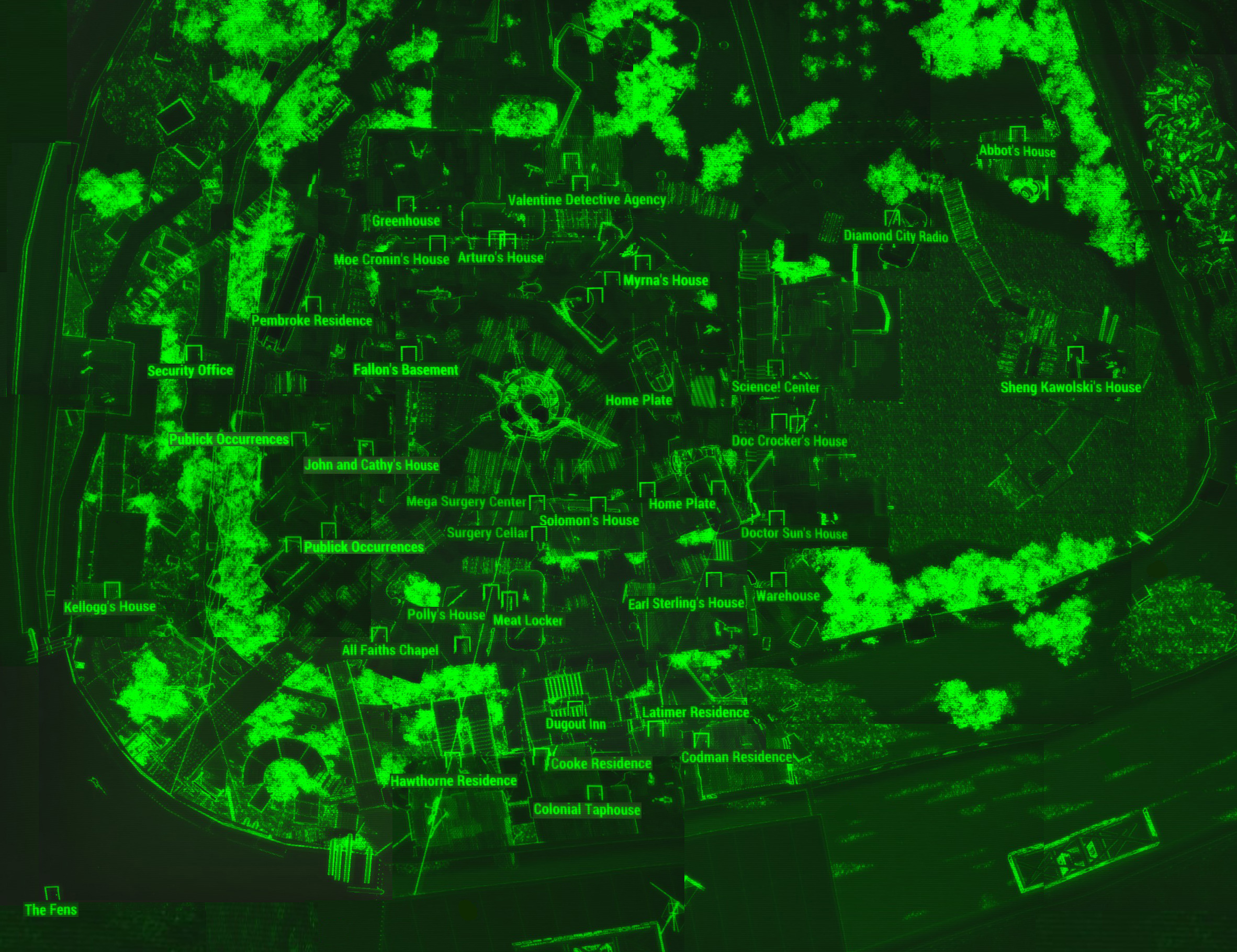 - ↑ Vignette d'écran de chargement: "Diamond City, the "Great Green Jewel" of the Commonwealth, is the area's largest and most secure settlement."