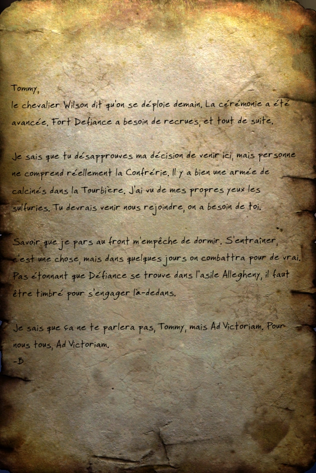 Je sais que tu désapprouves ma décision de venir ici, mais personne ne comprend réellement la Confrérie. Il y a bien une armée de calcinés dans la Tourbière. J'ai vu de mes propres yeux les sulfuries. Tu devrais venir nous rejoindre, on a besoin de toi.