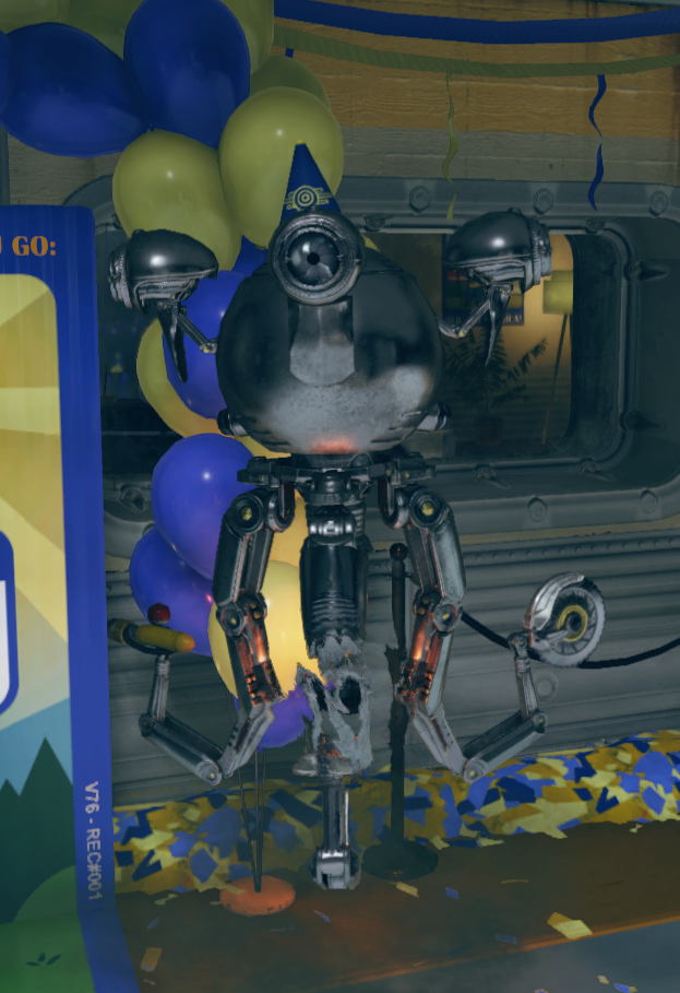 Merriman est l'un des nombreux Mister Handy qui font leurs adieux aux résidents quittant l'Abri 76. Il tient le stand 4, "Rejoindre une équipe !" ou un chapeau de fête est offert aux résidents.