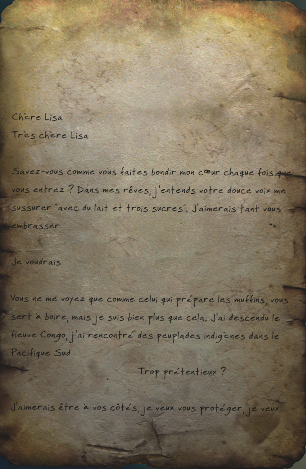 Savez-vous comme vous faites bondir mon cœur chaque fois que vous entrez ? Dans mes rêves, j'entends votre douce voix me rassurer "avec du lait et trois sucres". J'aimerais tant vous embrasser