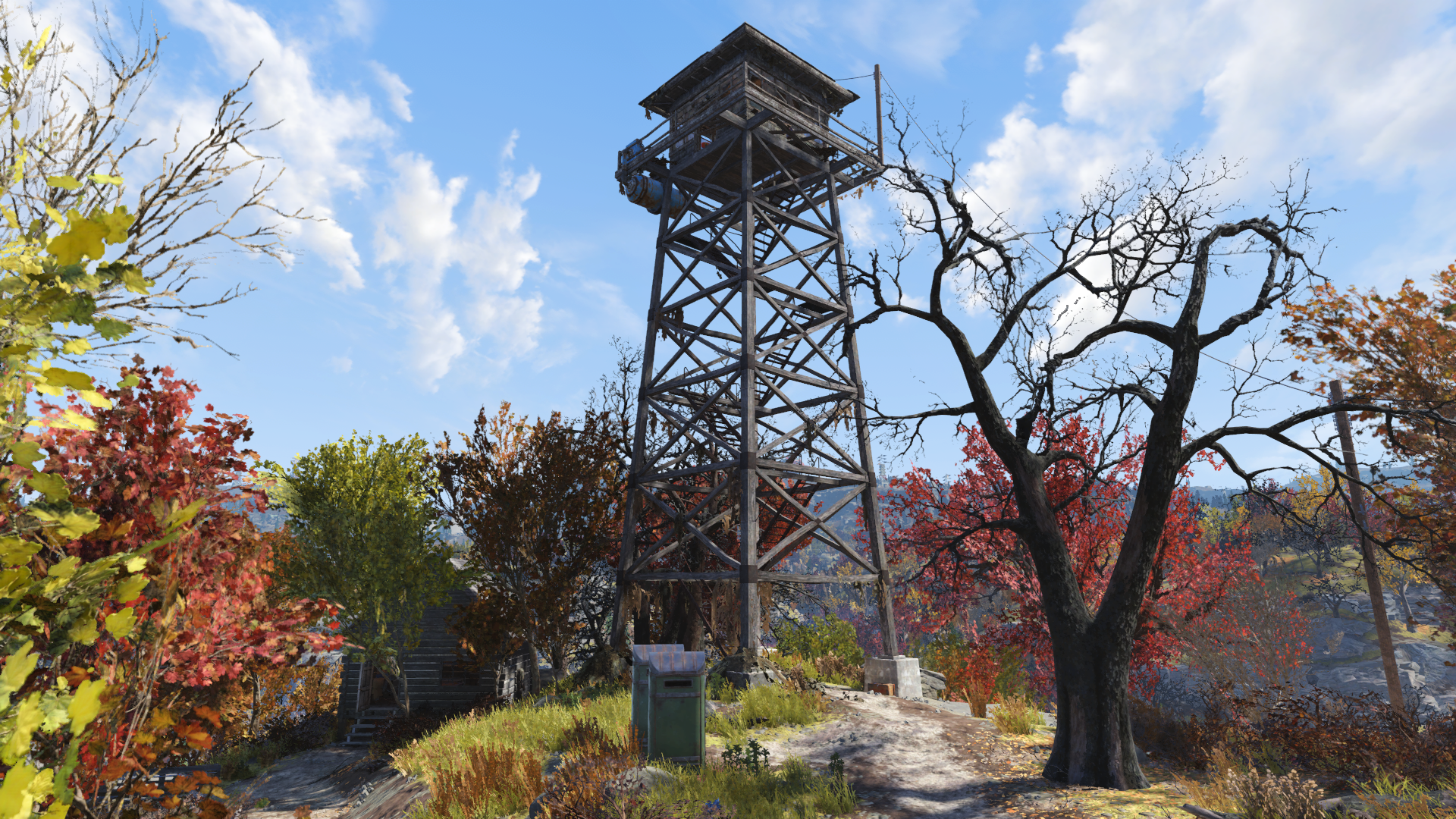 Une caisse d'explosif verrouillé se trouve au pied de la tour. Il y a plusieurs cabanes à proximité de la tour, dont l'une contient une guitare acoustique et la note Revenez quand vous voudrez.