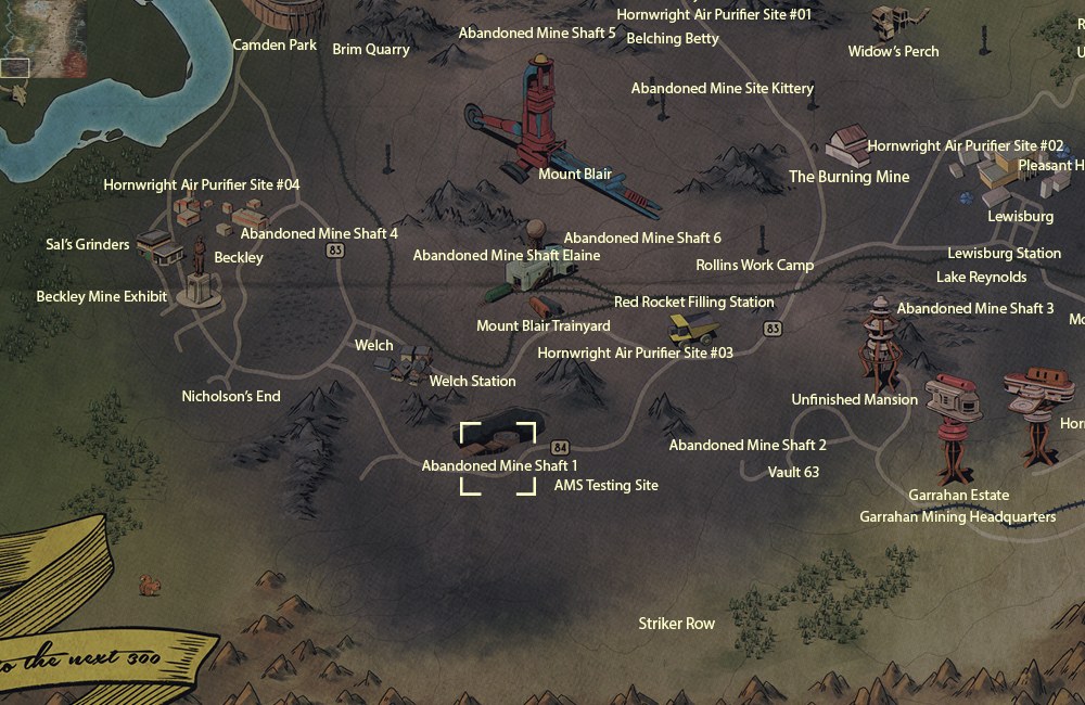 Abri 79 ·Abri 94 ·Abri 96 ·Allée de l'éventreur ·Antenne radio nationale isolée ·Ascenseur Monorail ·Barraque à barbecue de Big Fred's ·Bâtiment Dent et Fils ·Bed & Breakfast montagnard ·Bivouac US-13C ·Cabane d'enquêteur ·Camp de l'exploitation forestière Sylvie & Fils ·Camp des fils de Dane ·Camp du gang Seneca ·Camp du nord des Impitoyables ·Camp du sud des Impitoyables ·Centrale secondaire de Monongah MZ-01 ·Centrale secondaire de Monongah MZ-02 ·Centre nationale de la recherche radio astronomique ·Centre de recherche West Tek ·Chalet d'Autumn Acre ·Chalet de la famille Bailey ·Chalet de la station de ski de Sunnytop ·Chalets de Middle Mountain ·Décharge de munitions ·Décharge d'Emmett Mountain ·Déchèterie Sécuripropre ·Distillerie Yellow Sandy ·Échine du diable ·Ferme des Beckwith ·Fort Atlas (anciennement Observatoire ATLAS) Foundation (anciennement Spruce Knob) ·Gare de R&G Station ·Grotte de Hopewell ·Grotte du wendigo ·Huntersville ·La cour des miracles ·Lac Eloise ·Lacs jumeaux ·Le trou à tourbe ·Ligne régionale NCA 98 ·Maison de la citrouille ·Manoir Ingram ·Mare de Solomon ·Meat 'n Go de Larry le toxico ·Mine de Blackwater ·Mine de la chance enfouie ·Metal Dome ·Metal Dome ·Monongah (Centrale de Monongah ·Cour de la centrale de Monongah) ·Nouveau dépôt centrale des Appalaches ·Observatoire ·Palais du layon venteux ·Poste d'observation ·Poste d'observation d'altitude Centrale ·Poste d'observation d'altitude Est ·Poste d'observation d'altitude Nord ·Poste d'observation d'altitude Sud ·Poste d'observation de Skullbone ·Promontoire de Monongah ·Promontoire panoramique ·Red Rocket Mega Stop ·Seneca Rocks (Office du tourisme de Seneca Rocks) ·Services de traitement de R&G ·Site Alpha ·Site Bravo ·Site Charlie ·Site d'enfouissement fédéral HZ-21 ·Sommet du Monde (Chalets de Pleasant Valley ·Station de ski de Pleasant Valley ·Gare de Pleasant Valley) ·Spruce Knob (Campement de Spruce Knob ·Canaux de Spruce Knob ·Lac de Spruce Knob) ·Station de ski de Sunnytop (Gare de Sunnytop ·Sugar Grove ·Terre des Johnson ·Tour relais EL-B1-02 ·Tour relais LW-B1-22 ·Usine de munitions reconvertie ·Complexe de Whitespring (Club de golf de Whitespring ·Entrée de service de Whitespring ·Gare de Whitespring ·Le bunker de Whitespring bunker ·Poste d'observation de Whitespring)