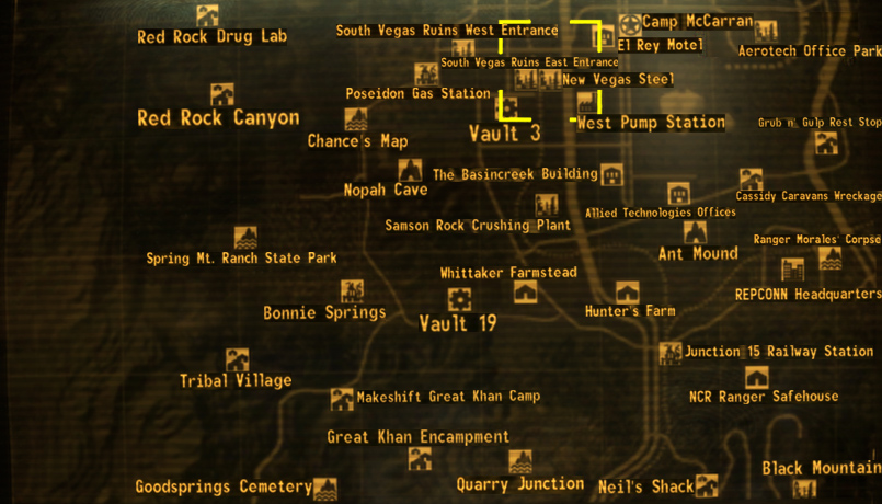 Acciaio di New Vegas è una località della Zona contaminata del Mojave. Si trova a sud di Westside e a sudovest di Camp McCarran. E' nel cuore del territorio dei Demoni e l'interno è infestato da robot ostili.