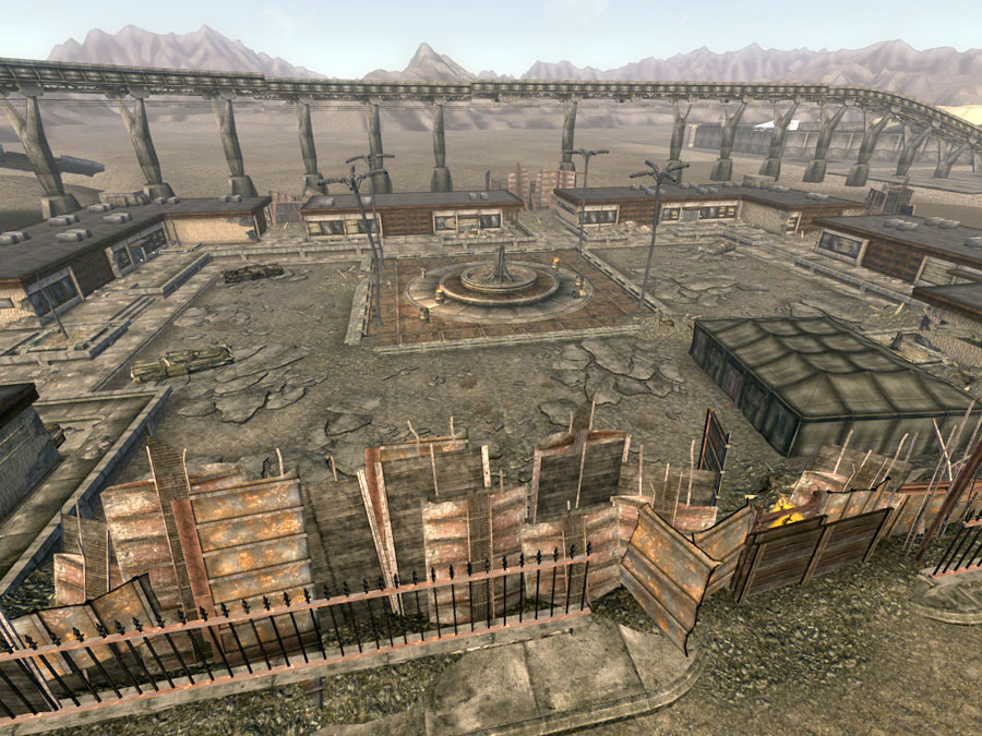 Prima della guerra, l'Aerotech Office Park era un complesso di uffici che ospitava diverse aziende che operavano nel settore meccanico. Rimasto abbandonato per quasi due secoli, è stato in seguito occupato dall'RNC, che lo ha trasformato in un campo profughi. Ospita soprattutto vagabondi e senzatetto che hanno perso tutti i loro soldi dopo aver tentato la fortuna a New Vegas. Molti profughi che vivono nel campo sperano di guadagnare i tappi necessari per riuscire a entrare nella Strip. Alcuni di questi riescono a trovare un lavoro onesto, ma la maggior parte finisce per spendere quel poco che risparmia in giochi truccati e superalcolici.