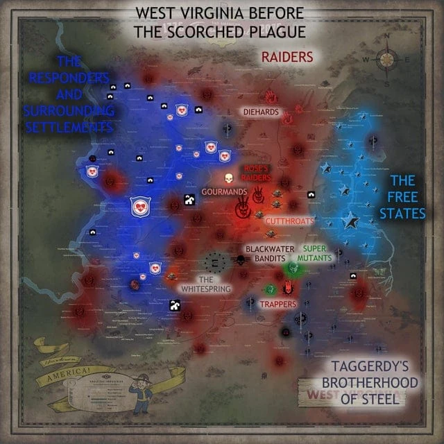 Dopo aver completato la main quest, l'abitante del Vault tornerà al proprio Vault per riferire ai vecchi compagni l'esito della missione e far abbandonare gradualmente a tutti il rifugio. Durante la strada per l'arrivo, l'abitante incontrerà due coloni sopravvissuti, Lacey Drummond e Isela Mejia, che gli parleranno di un rifugio sicuro, il Wayward, un locale poco distante brulicante di coloni, robot, avventurieri e, raramente, qualche predone. L'abitante dunque, durante la sua esplorazione, potrà decidere di visitare la vicina segheria WV Lumber Co., dove farà la conoscenza del leader dei Radicali Liberi, Roper, il quale gli chiederà di raccogliere informazioni private presso il locale in questione, oppure potrà recarsi direttamente al suo interno, dove farà la conoscenza della titolare, Duchessa, e di Mort, un ghoul non aggressivo. All'interno del locale, ci sarà la prima scelta concreta del gioco: uccidere o salvare un radicale libero che sta compiendo una rapina. Fatto ciò, Duchessa ci parlerà dettagliatamente dell'Appalachia post-bellica e dei due nuovi insediamenti a nord e a sud della regione, gestiti da comunità di coloni e predoni, chiamati Crater e Foundation. Inoltre, Duchessa parlerà di quella che è a tutti gli effetti una piaga, che fa sì che molti ardenti circolino in Appalachia, fornendo all'abitante del Vault nuove informazioni su di essi, compresa la notizia di una nuova "febbre dell'oro" che circola nella zona. Ma oltre alle due fazioni principali, Duchessa racconta all'abitante che si sono insediati nella regione fazioni molto pericolose ed egli, tramite una serie secondaria di missioni, dopo aver fatto la conoscenza di Beckett e di altri alleati, esplorerà i loro avamposti. Le fazioni secondarie finora conosciute sono i Cultisti dell'Uomo Falena, le Aquile Sanguinarie, i Radicali Liberi, i Servizi Segreti e alcuni predoni saccheggiatori sparsi per l'Appalachia.