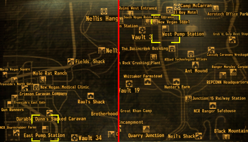 Le Stazioni di pompaggio sono due località della Zona contaminata del Mojave. La Stazione di pompaggio est si trova a est delle Fattorie dei mezzadri, mentre la Stazione di pompaggio ovest a ovest del Vault 3.