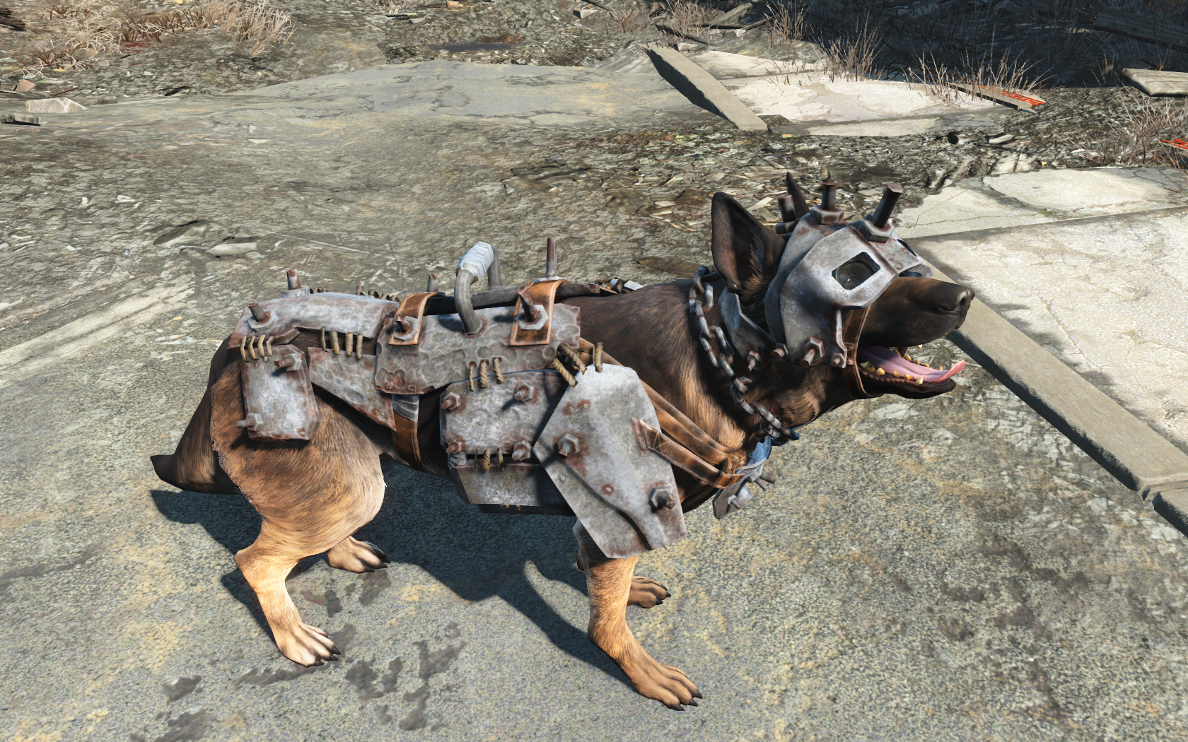 Dogmeat wearing welding goggles, dog helmet, chain dog collar & heavy dog armor