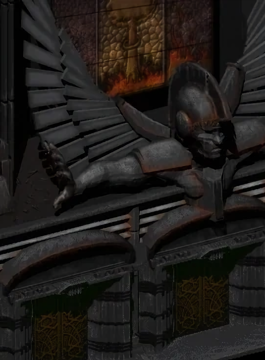 ボーンヤードの広がる廃墟の上にそびえるカテドラルは、ほぼ完全な状態である。その厳格なアールデコ建築は、周囲の通りを威圧的に見下ろし、その完璧で丸みを帯びた対称性で独特のシルエットを描いている。華麗な入口の上には、ヘルメットをかぶった鎧の天使の彫刻が、両腕を伸ばして二つの力を押し戻すかのように挑戦的にポーズを取っている。この腕の後ろには、複雑な無機的な翼が上に向かって伸びており、これもまた完全に対称的である。この人物は中性的で、腰から上の部分だけが描かれている。
