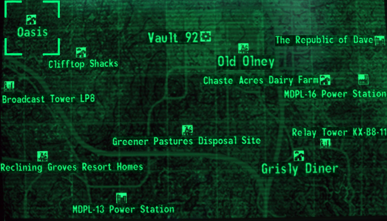 Jak znaleźć wejście do Oazy: W pobliżu końca środkowo-północnej części mapy znajduje się droga biegnąca równolegle z torami kolejowymi. Podążaj wzdłuż niej aż do dwóch porzuconych wagonów kolejowych. Podejdź do wagonu wysuniętego najbardziej na północ, stań po wschodniej stronie wagonu i spójrz na zachód. Litery "CMR" powinny być widoczne na boku wagonu, a za Tobą będzie sterta złomu. Obróć się i podążaj na wschód od złomu. Nad dziurą w skale prowadzącej do oazy będzie most. Przejście przez niego i podążanie ciągle we wschodnim kierunku zaprowadzi Cię bezpośrednio pod bramę Oazy. Gdy spojrzysz na lokalną mapę, luka w skale będzie znajdować się w ich lewym górnym rogu.