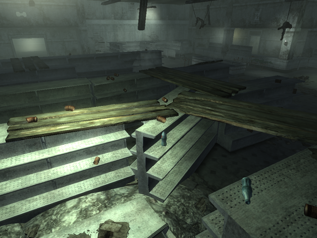 Wnętrze sklepu wypełnione jest sklepowymi półkami, na których Bandyci położyli prowizoryczne kładki. Oprócz regałów, jest także kilka małych pomieszczeń, oraz damska i męska toaleta. Bandyci patrolują "ziemię" jak i kładki powyżej.