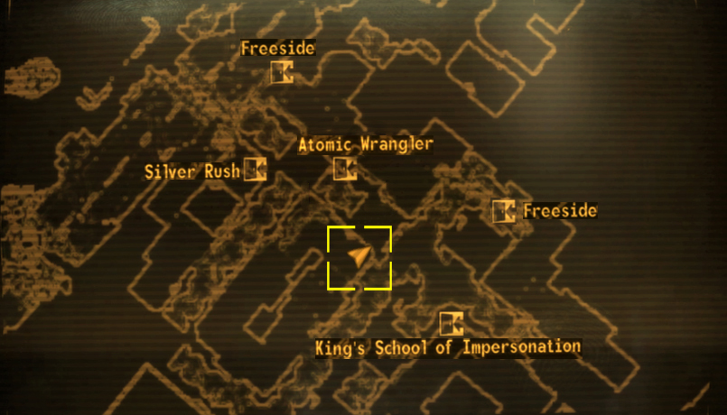 Atomic Wrangler casino ·Atomic Wrangler corner room ·Cerulean Robotics ·Freeside's East Gate ·Freeside's North Gate ·King's School of Impersonation ·Mick & Ralph's ·Old Mormon Fort ·Ruined store ·Silver Rush