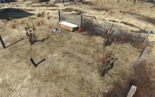 As plantas batate estão em abundância, prontas para serem colhidas nos fundos de Diamond City, onde as plantações estão e os colhedores trabalham.