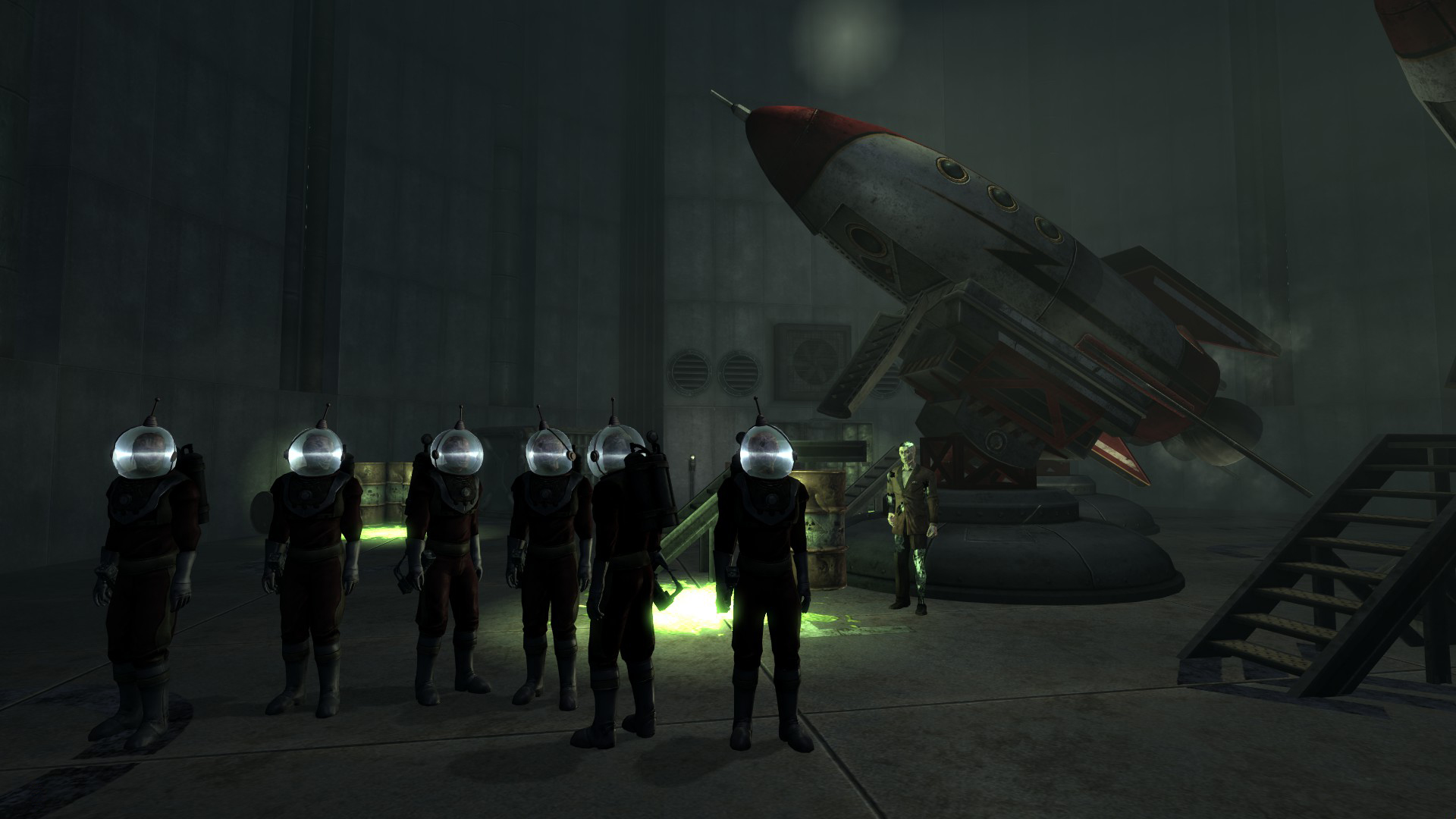 - Depois de completar Come Fly With Me ajudando a consertar os foguetes, um segmento de notícias da Radio New Vegas apresentará uma entrevista com No-bark Noonan, que testemunhou o lançamento do foguete e afirma corretamente que eles foram pilotados por ghouls religiosos em busca de um lar melhor. Mr. New Vegas apresenta o evento como uma afirmação não verificada por um "louco local".[17]