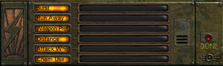 | Burst | Run Away | Weapon Pref | Distance | Attack Who | Chem Use |