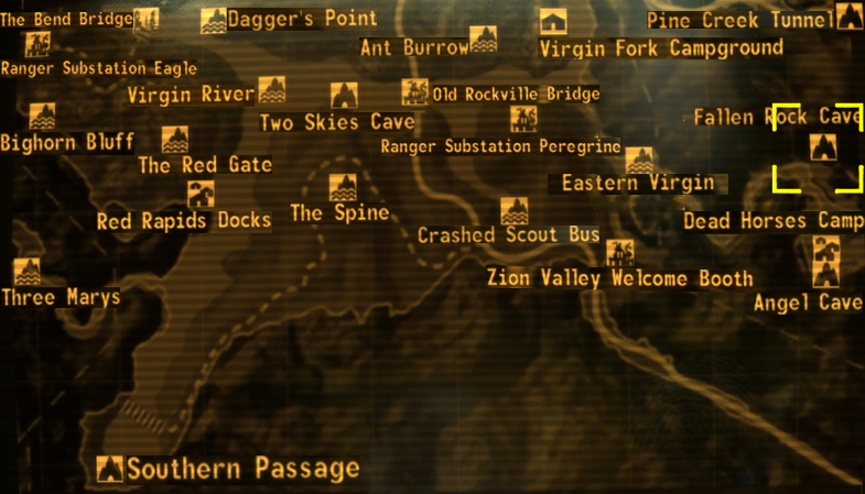 No entanto, como em outras cavernas, os itens armazenados ou descartados podem ser excluídos na primeira viagem de volta ao Mojave após a conclusão de Honest Hearts, portanto, será necessário limpá-los ao viajar entre as regiões.