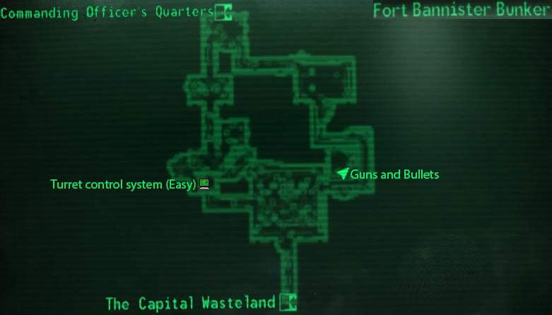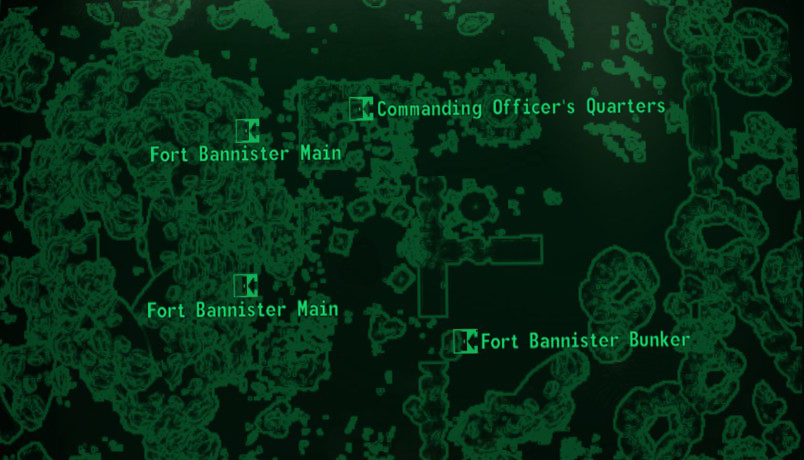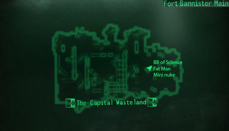 Em uma sala trancada na parte inferior da escada de concreto, há uma cópia de Big Book of Science, um Fat Man e uma mini nuke. Da entrada mais ao sul (trancada, muito fácil) para Fort Bannister Main, basta seguir os degraus de metal até o topo, continuar pela porta, à esquerda, descer as escadas de concreto e atrás de uma porta trancada (média).