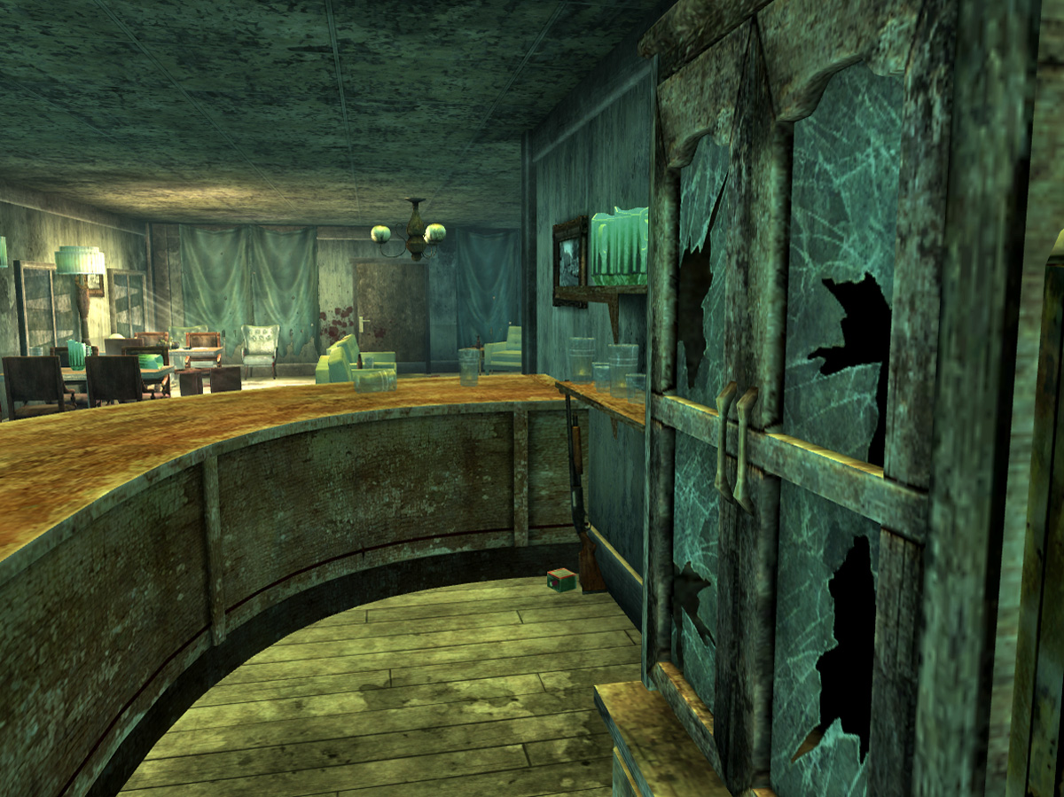 Dentro do lodge, os itens podem ser retirados de um armário de average lock localizado atrás do balcão do bar. A chave do armário pode ser encontrada em uma caixa no banheiro, ou o armário pode ser arrombado com uma habilidade de de 50 em Lockpick.