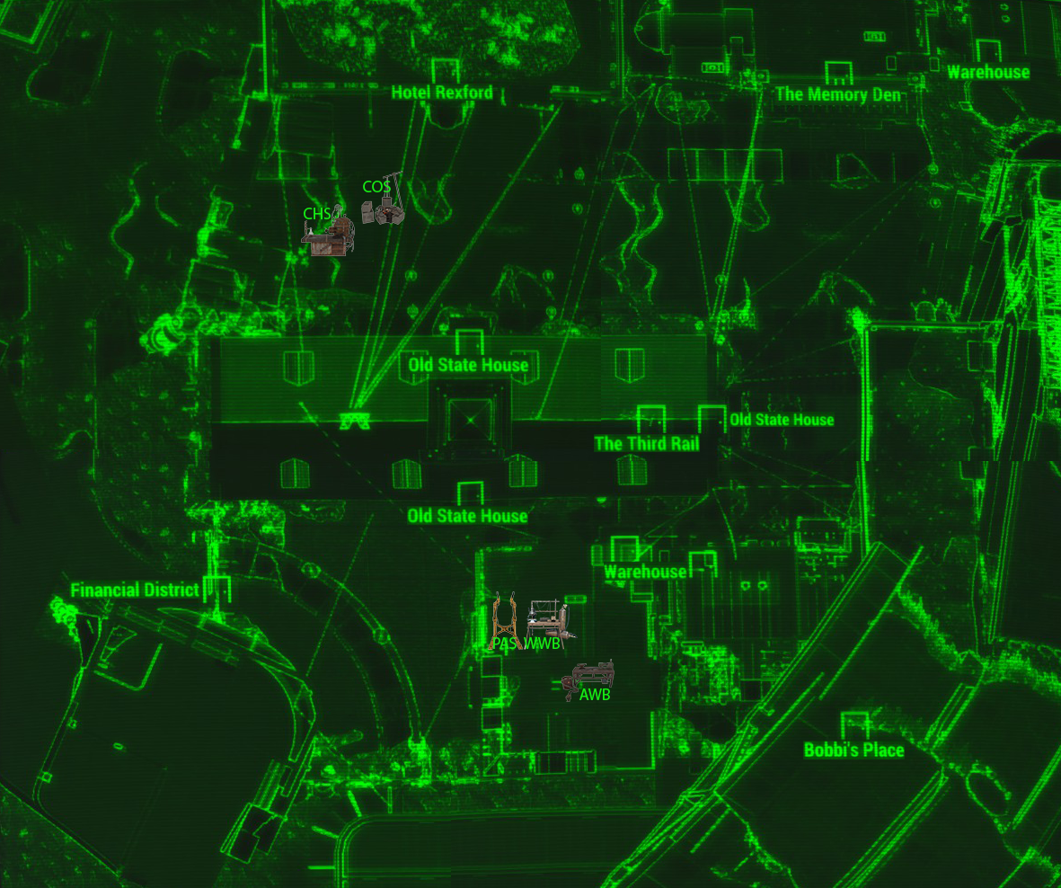 Casa do Abade ·All Faiths Chapel ·Chem-I-Care ·Choice Chops ·Colonial Taphouse ·Commonwealth Weaponry ·Mercado de Diamond City ·Diamond City Radio ·Diamond City Surplus ·Dugout Inn ·Home Plate ·Power Noodles ·Publick Occurrences ·Schoolhouse ·Science! Center ·Casa de Sheng Kawolski ·Swatters ·Valentine Detective Agency
