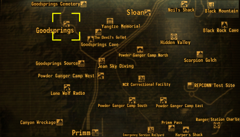Goodsprings contém uma escola abandonada com alguns itens de baixo nível e um Stealth Boy. Um posto de gasolina abandonado a oeste da casa de Doc Mitchell contém alguns saques menores e pode ser usado como refúgio, se necessário, pois contém uma cama e algum depósito seguro. O posto de gasolina está trancado até que o Menssageiro seja enviado para se encontrar com Ringo.