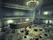 Ao entrar no Salão da Colunas haverá mais confrontos entre Super Mutantes e os mercenários, avance com cuidado. No final do Salão das Colunas há duas escadas, a segunda porta na parte inferior permite o acesso a quarta área, a Sala de Conferência.