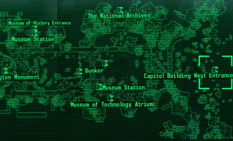 Lincoln Memorial ·Museum of History ·Museum of Technology ·National Archives ·The Capitol building ·Washington Monument ·Mirelurk nesting hole ·Museum Authority Building