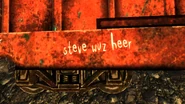 O acampamento consiste em um container de trem tombado apoiado sobre uma pedra, com duas grandes chapas retângulares de metal utilizadas como telhado. No container pode ser encontrado os grafites (possíveis de ser visualizados na Galeria logo abaixo na página) "FIGHT APATHY or dont...". No lado leste do trem existe uma pequena marca da qual pode se ler "steve wuz heer.". Outra marca pode ser encontrada no mesmo lado que está rabiscado mais, mas se você olhar com cuidado você pode ainda ler o texto "Jimmy is a weasel".