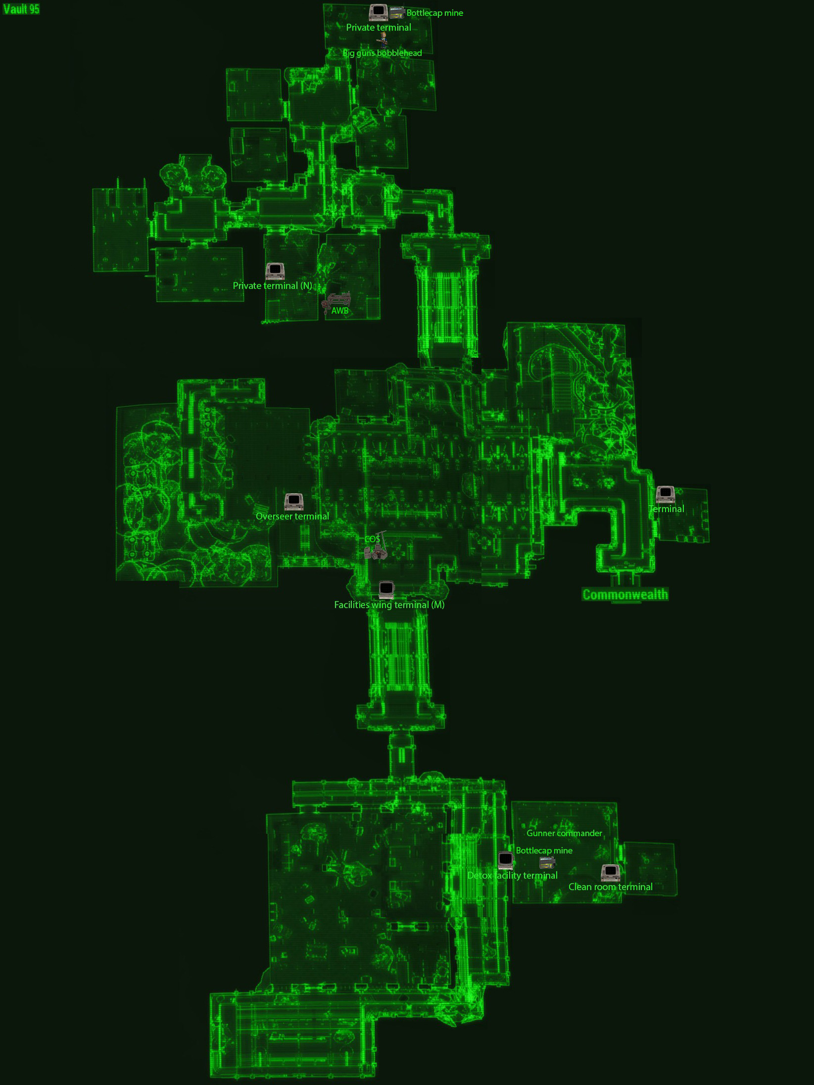 Conforme refletido nas Entradas de terminal do Vault 95, o programa de reabilitação foi eficaz na gestão do vício de seus residentes, com decisões para manter o programa permanecendo unânime durante os primeiros anos do refúgio. Registros pessoais revelam que a introdução de químicos efetivamente destruiu a família que os moradores haviam criado, com alguns moradores cedendo quase imediatamente aos seus desejos. Este esconderijo pode ser encontrado descendo as escadas para a área residencial, indo direto para os banheiros e, em seguida, olhando para a direita. Apesar do destino do vault, o estoque ainda contém quantidades moderadas de químicos e álcool.