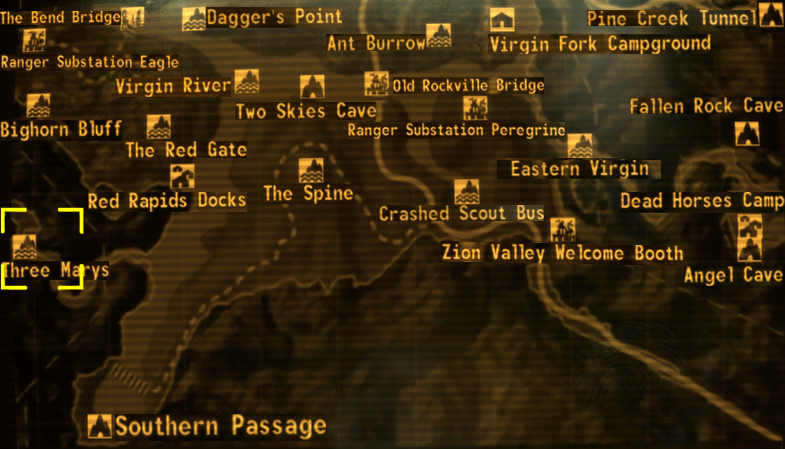 - A caverna das Three Marys não aparecerá na bússola do personagem do jogador, nem pode ser descoberta como um local de viagem rápida até que Crush the White Legs seja iniciada. O último é devido ao caminho principal através do cânion estar permanentemente bloqueado durante a missão, exigindo que a caverna seja usada para contornar as rochas ao revisitar Zion mais tarde.