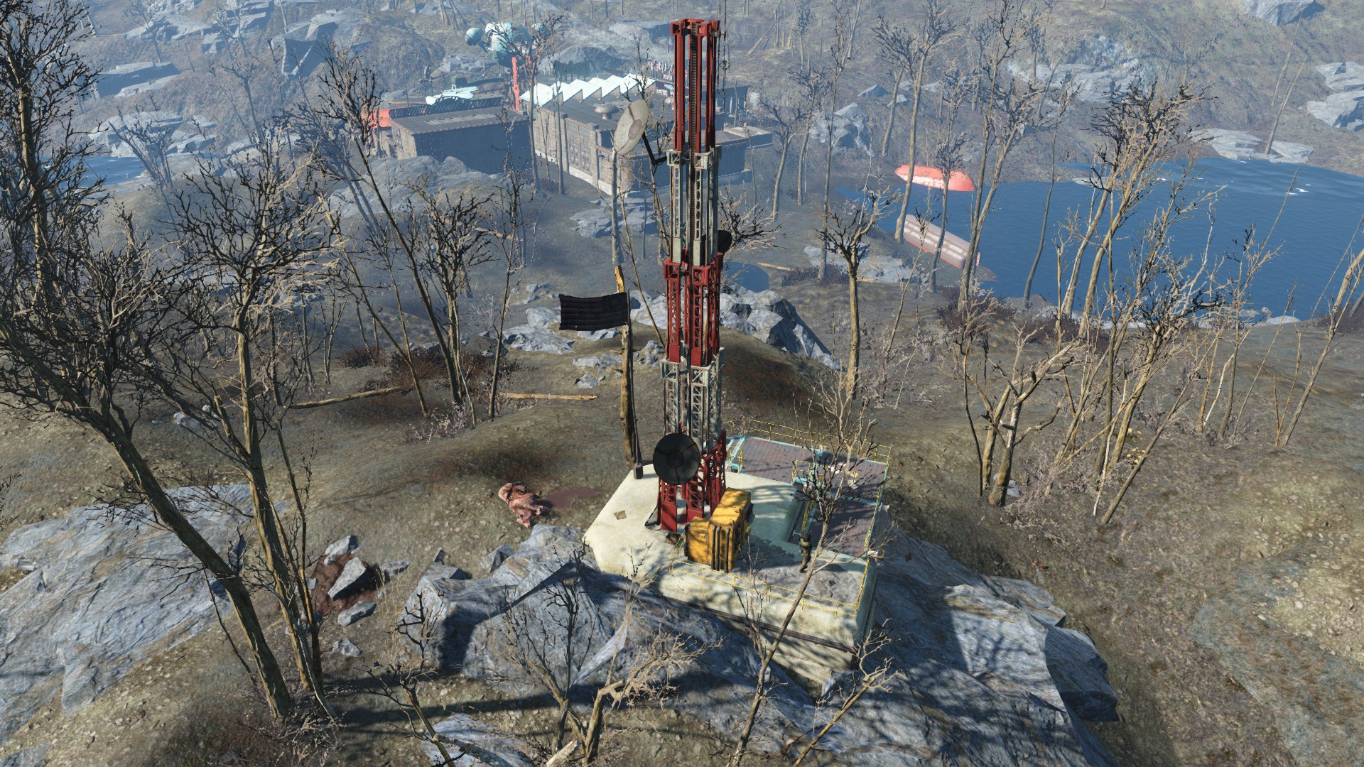 Uma grande torre de rádio no topo de uma colina cercada por até quatro sanguinsetos, alguns cadáveres de brahmin e um comerciante falecido perto das escadas da torre. O terminal de retransmissão possui um computador desbloqueado com a opção de "estender antenas para amplificar sinais na área circundante". Ativar isso revelará vários sinais de rádio que não estavam disponíveis na área anteriormente.