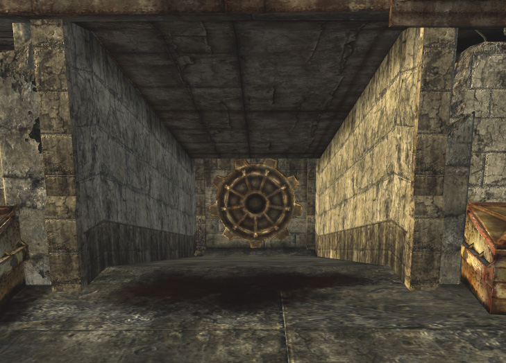 a porta do vault, que é aberta pelo painel de controle adjacente, é conectada diretamente às ruínas de South Vegas e, portanto, não fornece nenhum ponto de carregamento para o interior do abrigo. Isso explica a falta de uma sequência de abertura de porta.