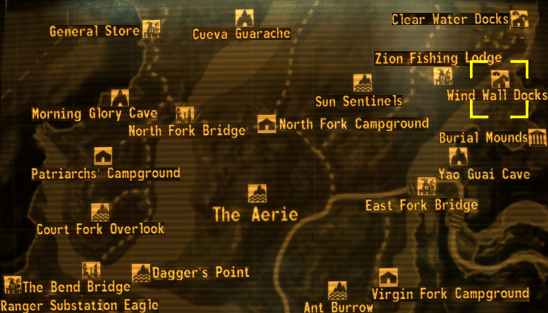 Wind Wall docks é uma localidade em Zion Canyon em 2281. É uma localização privilegiada para cazadores e outros animais mutantes.