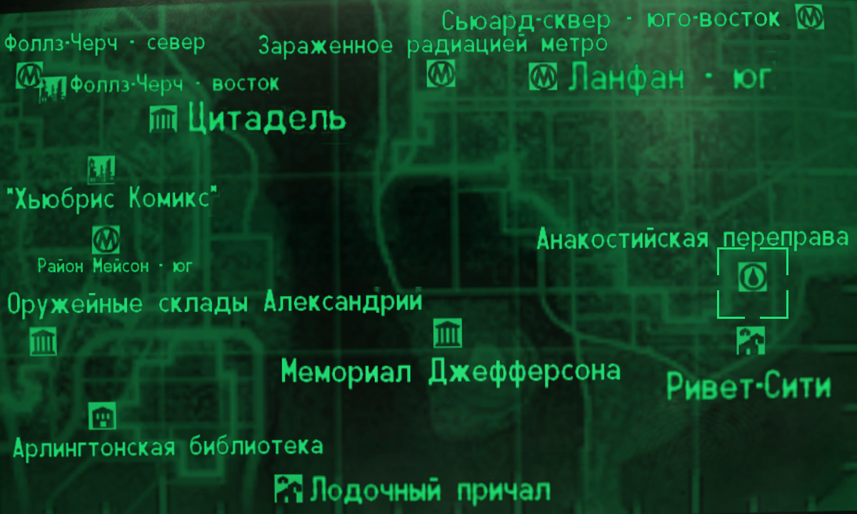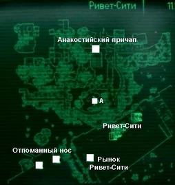 Территория на Столичной Пустоши у реки, в которой стоит город-корабль Ривет-Сити, с небольшой площадью вокруг павильона спуска на станцию красной ветки метро «Анакостийский причал», через которую можно попасть в деловой центр Вашингтона, в чём можно убедиться, рассмотрев схему линий на информационных стендах.