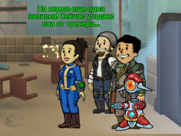 - «На земле ещё одна записка! Сейчас угадаю: она от тренера… „Ладно, может быть, вы, Жители, не так бесполезны. Пустошь делает всё, чтобы остановить вас, но вы не сдаётесь! Но майку Джобинсона ты всё равно не получишь!“ — Тренер».