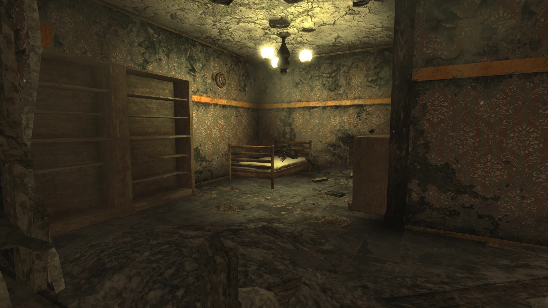 - Номер комнаты выглядит как 107 или 307 (но кажется, этот номер стоит на каждой комнате этого уровня). Двери лифта, поднявшегося до ресторана, открываются на север, а номер с голодиском — первый к юго-востоку. У него два входа. К западу расположены 2 спальни (стена между ними разрушена), слева стоит «королевская» кровать, а правая — поменьше — это та самая, на которой лежит скелет, оружие, боеприпас и голодиск (появляется только после спасения рейнджеров Рейли.)