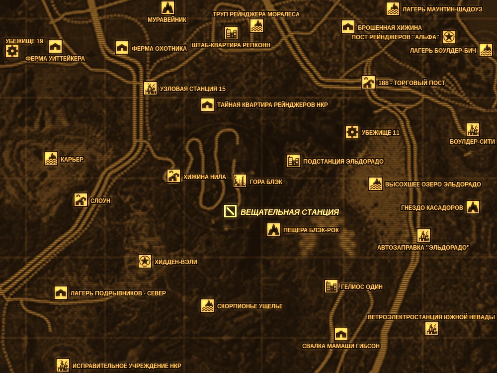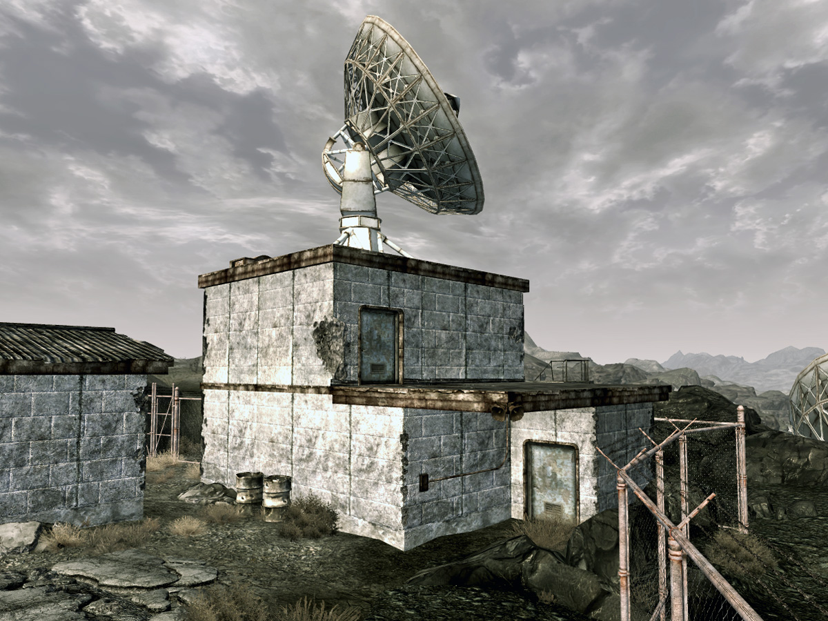 Вещательная станция находится на вершине горы Блэк за забором с воротами. Это крайнее правое от центральных ворот на огороженной территории лагеря двухэтажное здание. Оно примечательно тем, что на его крыше установлена спутниковая антенна. Первый этаж имеет вход с территории лагеря и тыльный выход во двор. Со двора есть металлическая лестница на второй этаж. Во двор можно попасть только пройдя через первый этаж. Дверь на второй этаж заперта. Открыть её можно только имея ключ от комнаты Табиты. Ключ можно либо снять с трупа Табиты, либо украв у неё, либо найдя запасной под светло-серым камнем, заглянув под лестницу, ведущую на второй этаж. На втором этаже находится комната Табиты, из которой она ведет передачи радио горы Блэк. На первом этаже станции находятся два терминала, из записей на которых Курьер может узнать о событиях, произошедших за много лет до появления его на горе Блэк. Также из этих записей Курьер узнает о тайнике с запасным ключом на второй этаж. В комнате Табиты на втором этаже находится консоль, на которую по квесту «Слепой глаз» Курьер должен установить передатчик удалённого сигнала. Табита будет находиться в своей комнате на втором этаже, если Курьер проник в лагерь скрытно и сразу направился в вещательную станцию, не освобождая Рауля из тюрьмы и не ремонтируя робота Табиты Ронду в здании склада.