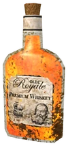 Небольшая плоская бутылка, под самое горлышко заполненная оранжевой жидкостью. Заткнута пробкой из дубовой коры. Бутылку украшает этикетка с надписями Olde Royale (производитель) и Premium Whiskey, а также изображениями парусника (слева) и бородатого человека (справа).