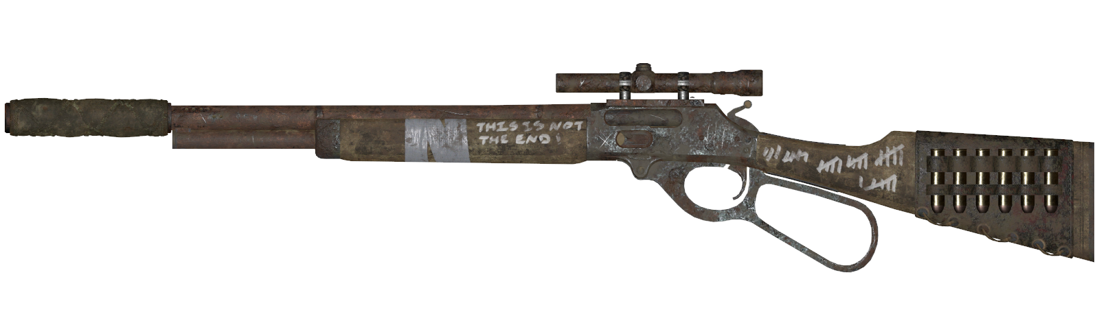 По умолчанию на оружии установлены следующие модификации: калиброванный ресивер, стабилизированный длинный ствол, ложа силы, длинный ночной прицел, глушитель и уникальный внешний вид с надписью «Это не конец» на цевье, которое частично обернуто в ленту и имеет многочисленные царапины счёта убийств на прикладе.
