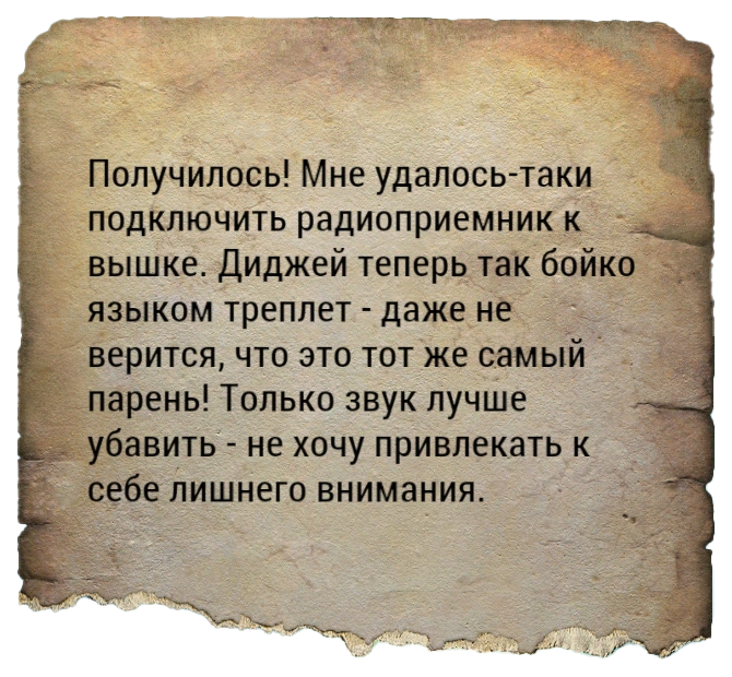 Получилось! Мне удалось-таки подключить радиоприёмник к вышке. Диджей теперь так бойко языком треплет — даже не верится, что это тот же самый парень! Только звук лучше убавить — не хочу привлекать к себе лишнего внимания.