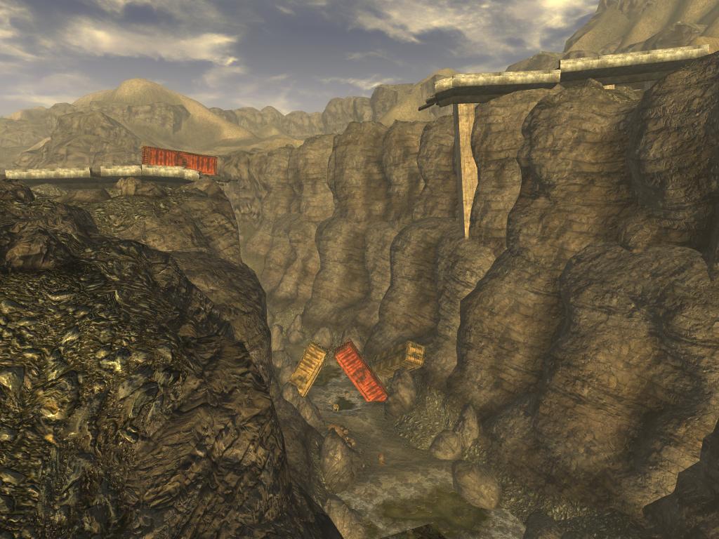 Внизу в каньоне находится множество разбитых машин, упавших с разрушенного хайвея, который когда-то пересекал эту местность, а также огромное количество бочек с радиоактивными отходами. В результате чего во многих местах имеется небольшой радиационный фон.