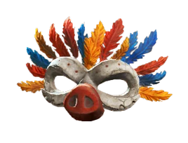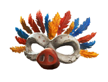 Довоенная полумаска из папье-маше, украшенная красными, синими и жёлтыми перьями и свиным пятачком, используется для введения врага в заблуждение.