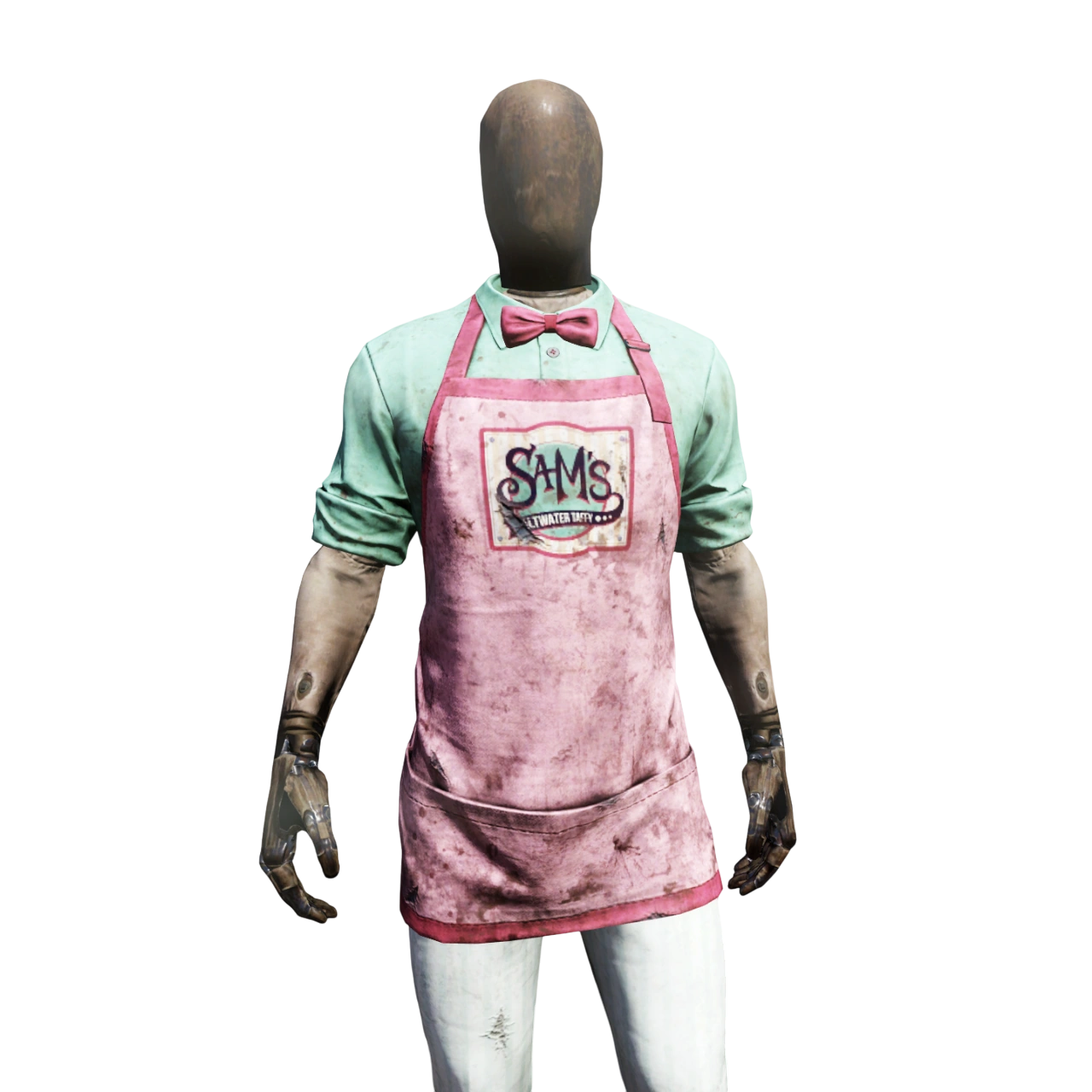 Светло-зеленая рубашка с короткими рукавами, слегка потрепанная и запачканная. Розовый фартук с передним карманом, также с признаками износа и загрязнения. На фартуке нанесен логотип "Sam's Saltwater Taffy" с декоративным дизайном. Маленькая розовая бабочка, завязанная под воротником рубашки. Белые брюки, которые выглядят изношенными, с заметными потертостями.