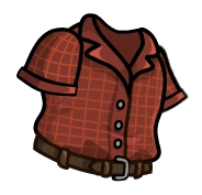 Мужская красная клетчатая рубашка с короткими рукавами, тёмные брюки и коричневые ботинки. Прилагаются накладные очки с усами и носом.