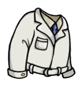 К белому лабораторному халату прилагаются рубашка, синий галстук и тёмно-синие штаны.