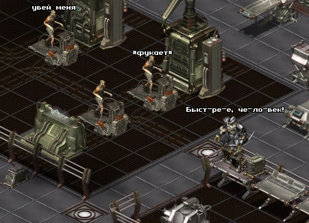 Внутри находятся несколько человек, прикованных к беговым дорожкам, движение которых вырабатывает энергию («человекобатарейки»), и надзирающий за ними робот-гуманоид серебристого цвета. Изначально робот не агрессивен.