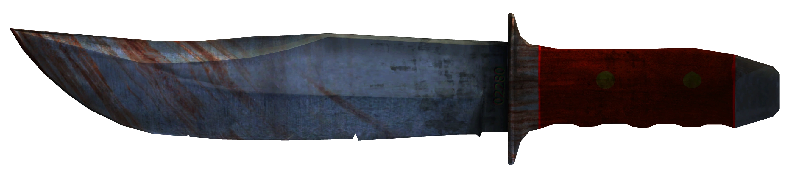 Длинный охотничий нож с клёпаной коричневой рукояткой и несколькими царапинами поперёк лезвия по диагонали. Металлические части затронула ржавчина, на основании клинка выбит серийный номер 02280.