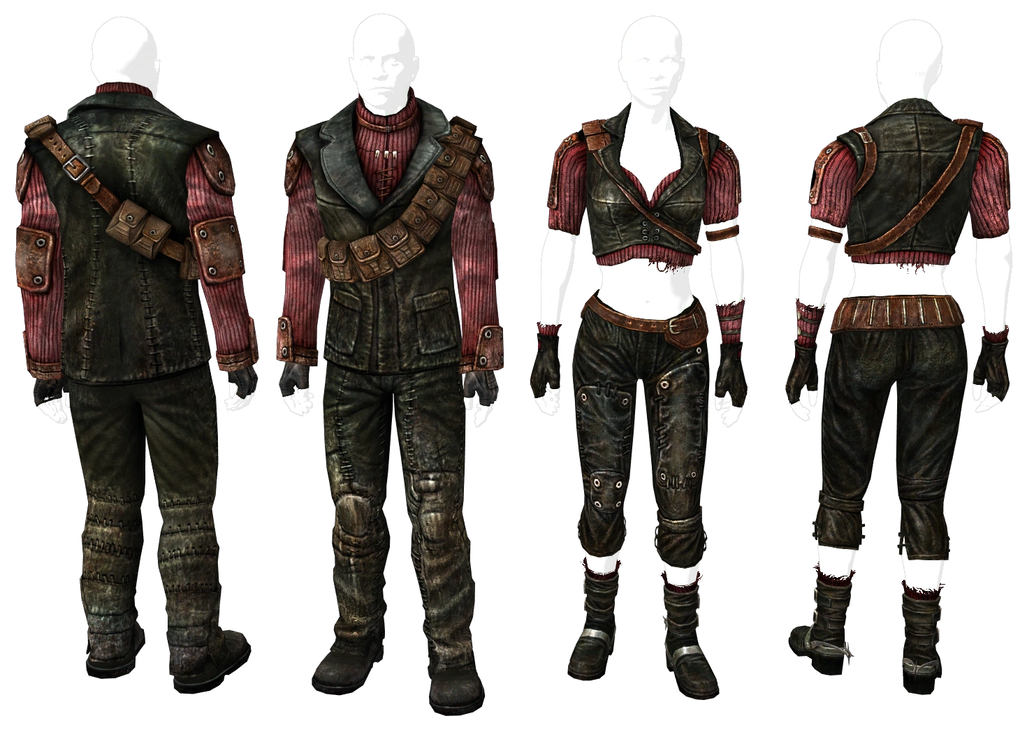 Все виды данной одежды присутствуют в игре в двух версиях: одна надета на встречаемых персонажах, вторая встречается только в контейнерах или у торговцев (кроме одежды Шранпнели из Ривет-Сити и обитателей Мегатонны). Каждая разновидность носимой персонажами обычно ремонтируется идентичной одеждой (с идентичным ID) или большинством аналогичных. «Контейнерные» версии одежды ремонтируются только идентичными и не годятся для ремонта своих «пар» или других видов.