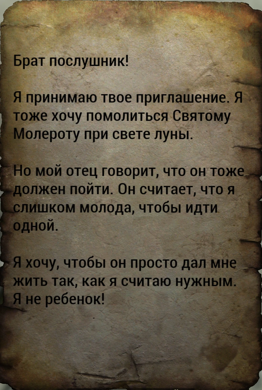 Я принимаю твоё приглашение. Я тоже хочу помолиться Святому Молероту при свете луны.