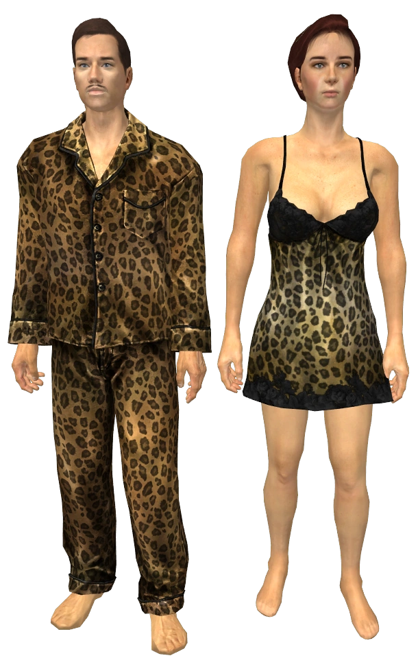 В мужском варианте — леопардовой расцветки с чёрной окантовкой; состоит из рубашки с карманом и отвёрнутыми манжетами и брюк. В женском варианте — короткая ночная сорочка такой же расцветки, но с отделкой чёрным кружевом.