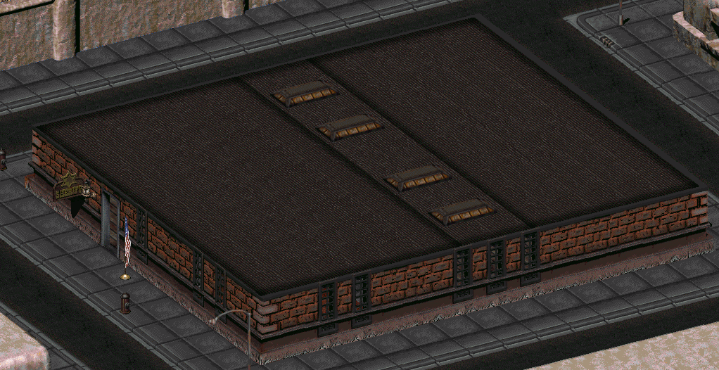 Напротив входа стоит стол и две скамьи, возможно, это рабочее место шерифа. Коридор направо ведёт к двум рабочим местам, а также офису. Далее следуют две камеры заключения, в которые при надобности сажают нарушителей. Дверь в конце коридора ведёт в охраняемый склад амуниции и прочих вещей.