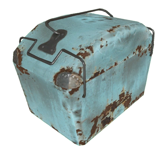 Довоенный минихолодильник для обеда или пикника, обычно встречающийся в пустошах. Внешне охладитель представляет собой светло-голубую коробку с ручкой, прикрепленной к крышке. Крышку можно свободно снять с контейнера, и она удерживается на месте проволочной защелкой с петлями на каждой стороне. Как правило, при обнаружении охладители будут содержать различную, преимущественно довоенную пищу, напитки, наживку (обычную) или наживку (улучшенную) с шансом 2.5%, боеприпасы, рецепты, но вариант с охладителем где внутри есть препараты также можно найти в локациях, принадлежащих рейдерам или кровавым орлам.